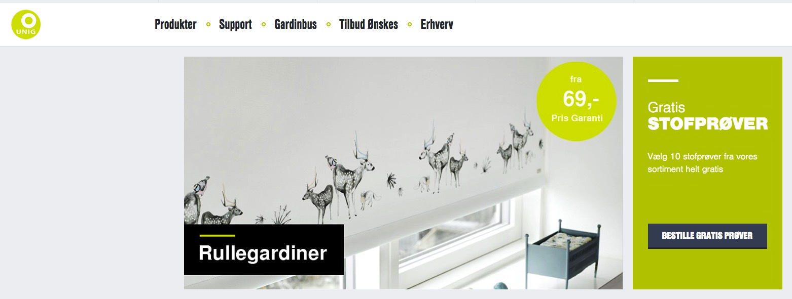 Kort om siden/virksomheden Uniggardin.dk er måske Danmarks største online butik, med salg af gardiner til bolig og erhverv. De blev grundlagt i 2006, og har altså derfor 10 års erfaring indenfor branchen. På Uniggardin.dk hjemmeside kan man læse at målsætningen med forretningen, er at levere skræddersyede gardiner af en utrolig høj kvalitet – men uden at gå på kompromis med kvaliteten. Uniggardin har ikke kun valgt at satse på det danske marked, som ofte har sine begrænsninger – men også andre lande som fx. Sverige og Norge, og du finder deres webshops på hhv. Uniggardin.se og Uniggardin.no. Udvalget og mulighederne hos Uniggardin er enorme, og du finder alt ligefra: persienner, lamelgardiner, mørklægningsgardiner, til ovenlysvinduer, mm.