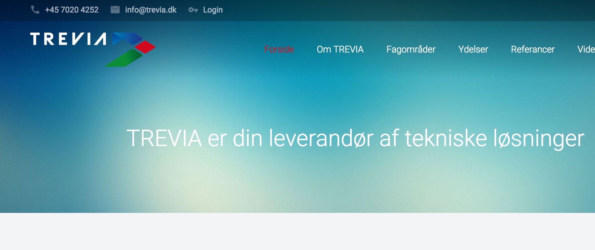 Kort om siden/virksomheden Trevia A/S er en autoriseret entreprise virksomhed som har speciale i tekniske installationer. De kan løse alt indenfor fagentreprise, storentreprise, mm. Deres speciale dækker b.la. fag som: VVS, EL, køleteknik – og alle deres håndværkere er veluddannede og har de gældende certificeringer. Trevia ligger stor vægt på at det skal være let at være kunde hos dem, og derfor har de altid kun én kontaktpers...